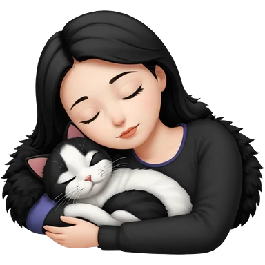 White girl with black hair sleeping with black cat emoji