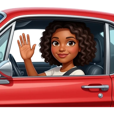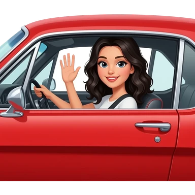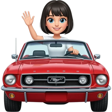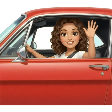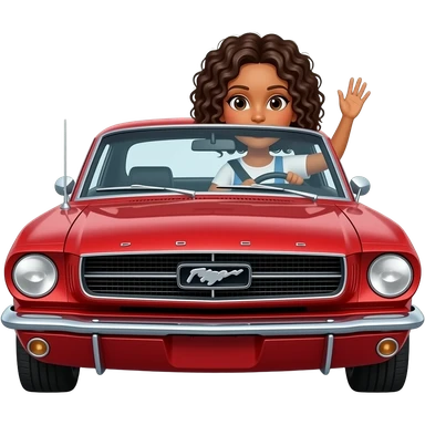 White girl with black curly hair driving a red Ford Mustang 1968 coupe and waving through the window. Car must be seen in full. emoji | AI Emoji Generator