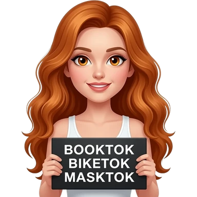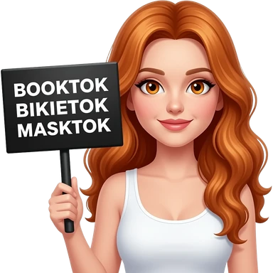 sexy girl with long wavy ginger hair and ginger eyes wearing a white tanktop is holding a black colored sign with BOOKTOK BIKETOK MASKTOK written on it emoji