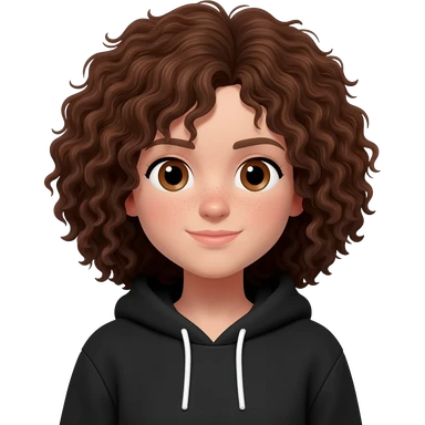 white girl with brunette curly hair and brown eyes with a black hoodie emoji