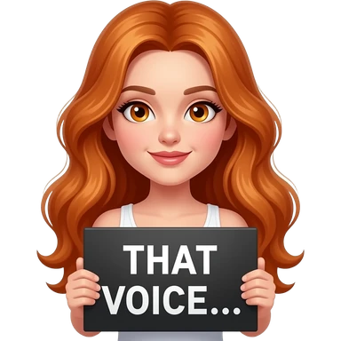 sexy girl with long wavy ginger hair and ginger eyes wearing a white tanktop is holding a black colored sign with THAT VOICE... written on it emoji