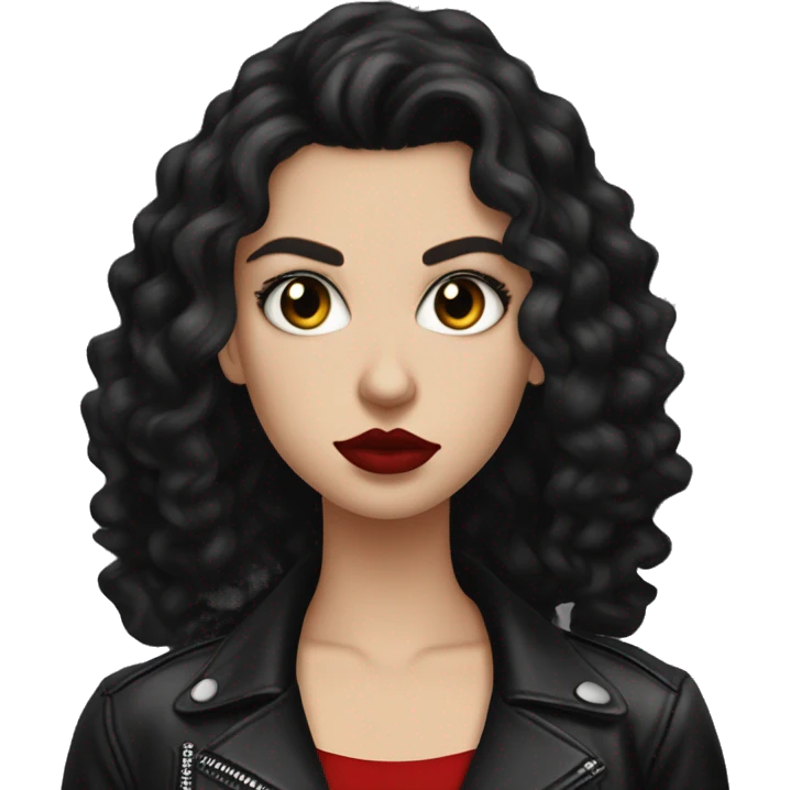 White girl, with long curly black hair, with red lipstick, black winged eyeliner, wearing black shirt and black leather jacket, rolling her eyes in annoyance emoji | AI Emoji Generator