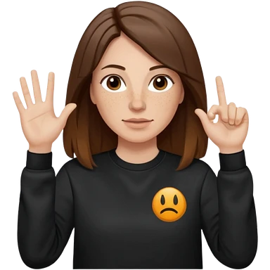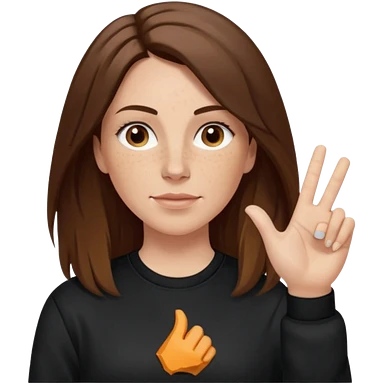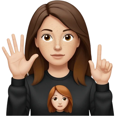 A 38 year old white woman with long brunette hair parted in the middle. She has her nose pierced. Her nose is medium sized. She has brown eyes. She has freckles and is wearing a black sweatshirt and is making the rock on sign with her hand emoji