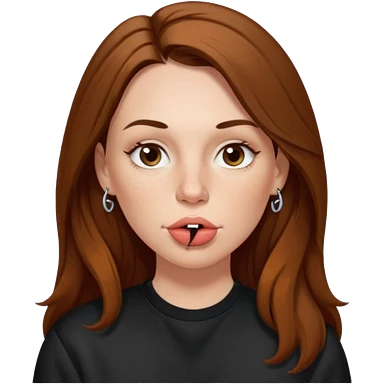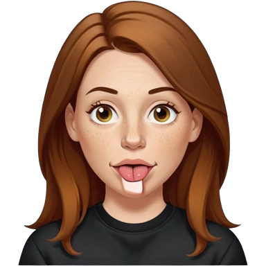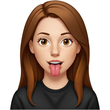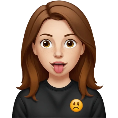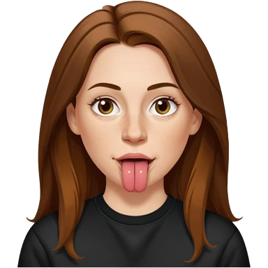 A 38 year old white woman with long brunette hair parted in the middle. She has her nose pierced. Her nose is medium sized. She has brown eyes. She has freckles and is wearing a black sweatshirt and is sticking out her tongue. emoji