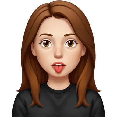 A 38 year old white woman with long brunette hair parted in the middle. She has her nose pierced. Her nose is medium sized. She has brown eyes. She has freckles and is wearing a black sweatshirt and is making a kissing mouth. emoji