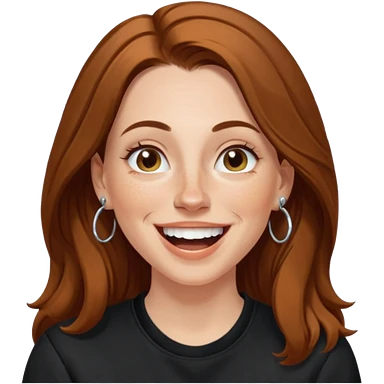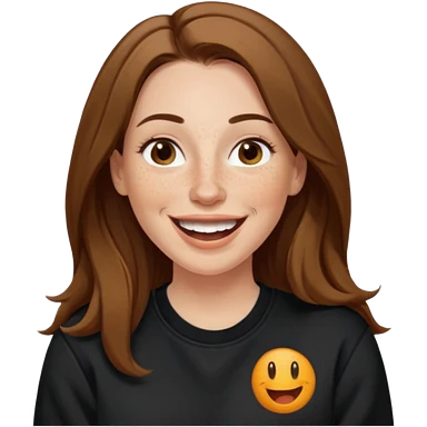 A 38 year old white woman with long brunette hair parted in the middle. She has her nose pierced. Her nose is medium sized. She has brown eyes. She has freckles and is wearing a black sweatshirt and is laughing emoji