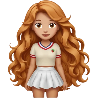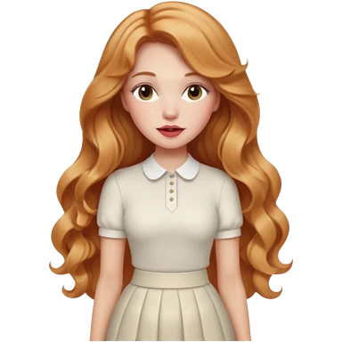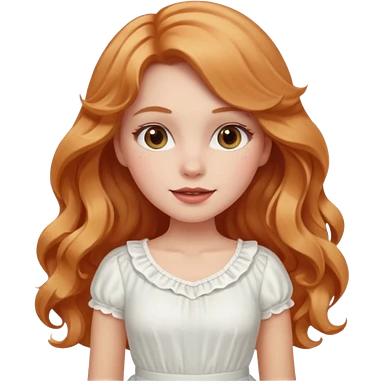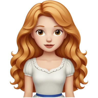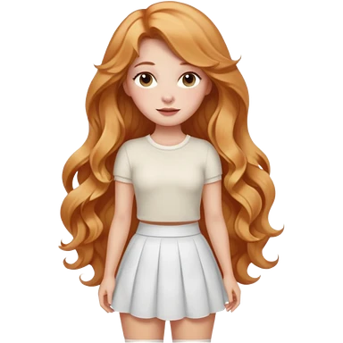 white girl with strawberry blonde super long wavy hair, white skirt, blushed cheeks emoji