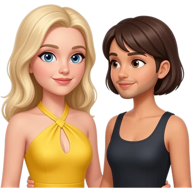 White blonde fiancé in halter yellow dress with brunette fiance with short facial hair proposal yellow dress emoji