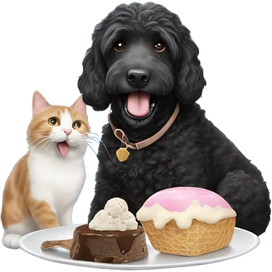Black labradoodle licking ice cream with a fat grey and white cat beside him emoji