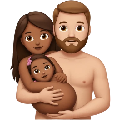 chubby white guy with brown hair and beard and blue eyes, holding a brown girl with long dark hair and dark brown eyes in arms, naked, showing tits and pussy emoji