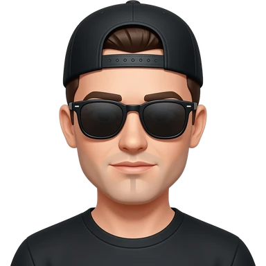 white man with glasses and black beard with a baseball hat backwards and a black t shirt emoji