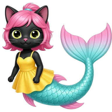 black anthro cat with pink hair yellow dress attached to long cyan and white tight long mermaid tail with pink fins emoji