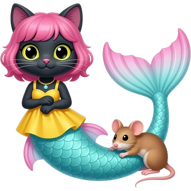 black anthro cat with pink hair yellow dress attached to long cyan and white tight long mermaid tail with pink fins wrapping around the mouse tightly emoji