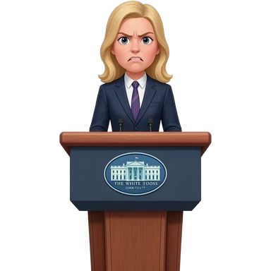 Karoline Leavitt behind the iconic White House briefing podium, with a pissed off dumb bitch face in a realistic photo like style, full body, blonde hair 20 years old emoji