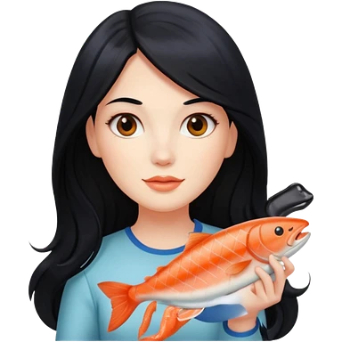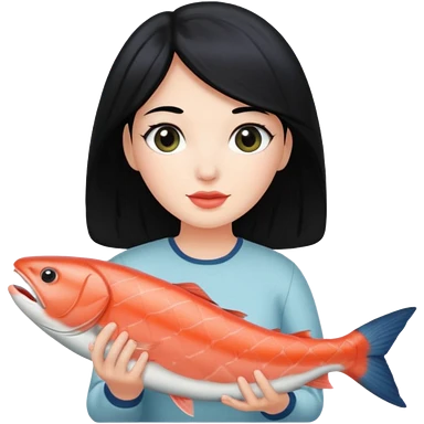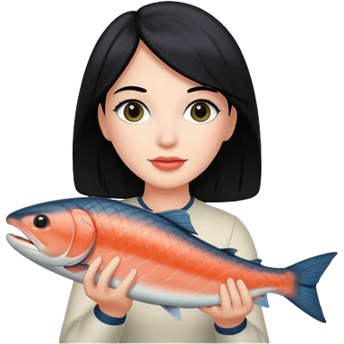 White lady with black hair holding a salmon emoji | AI Emoji Generator