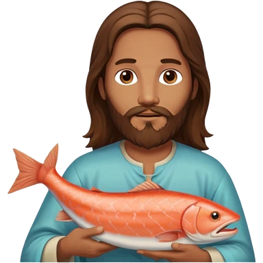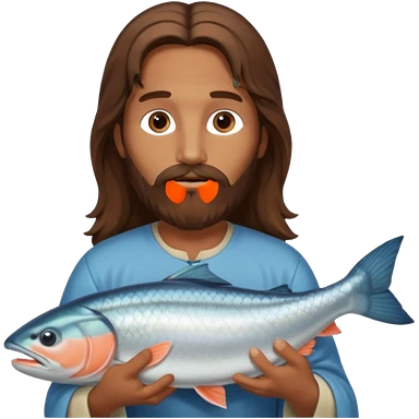 Jesus with long brown hair and a long beard holding a salmon emoji