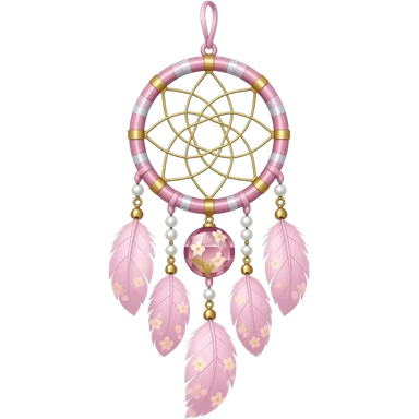 A white Dreamcatcher. with purple-round-orbs, gold-rings hanging down. purple flowers, pink sakura flowers, emoji