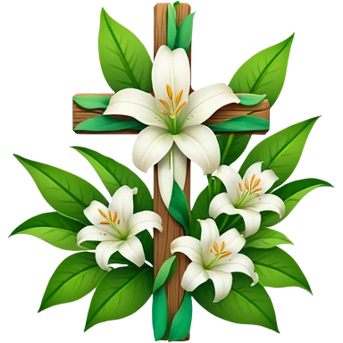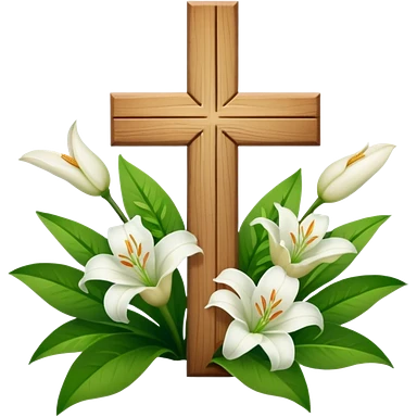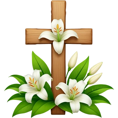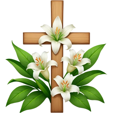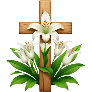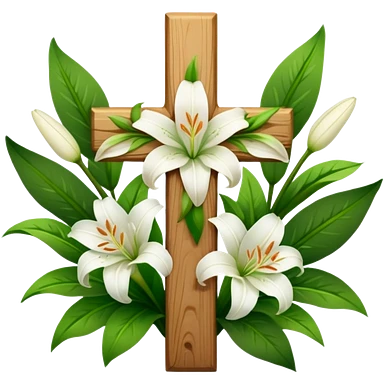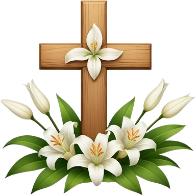 A wooden cross with white lilies around the bottom. emoji