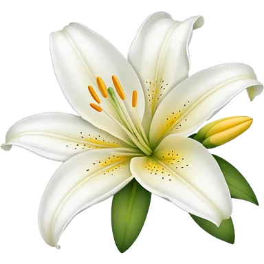 white lily flower with exactly six petals, one flower bud, and green leaves emoji