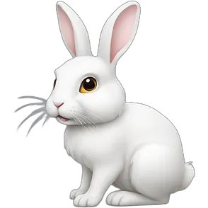 White super fluffy rabbit with dark brown spots, with one ear up and one ear down emoji