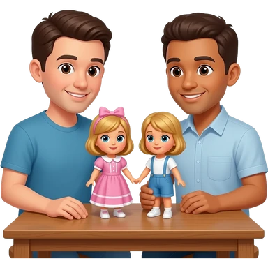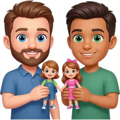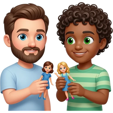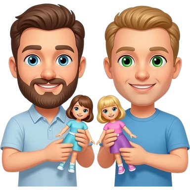 White guy with brown beard and second light brown skin guy green eyes and curly hair playing with dolls emoji
