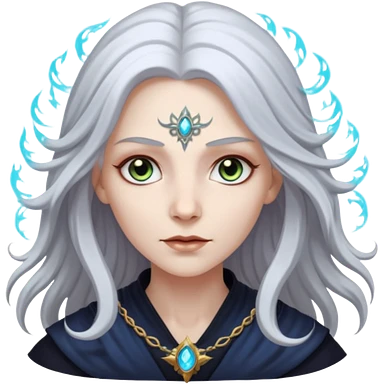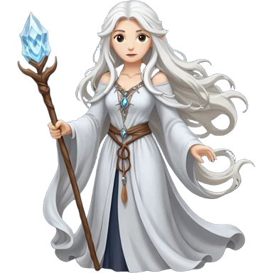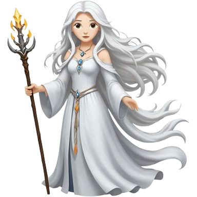 White silver Long Haired Women, Sorceress with staff — flowing white hair, calm face. emoji