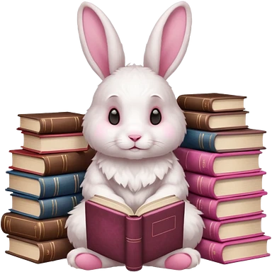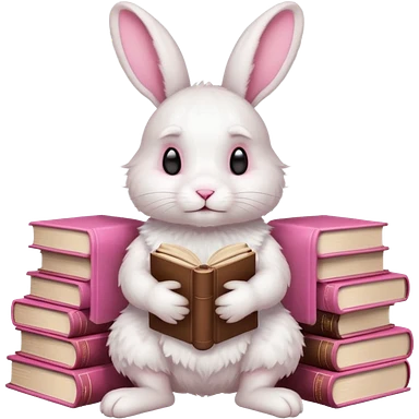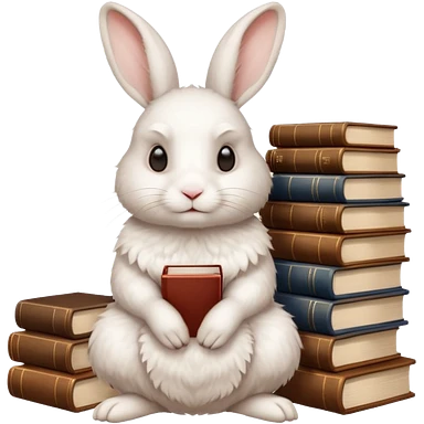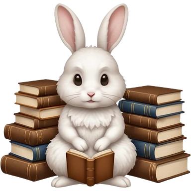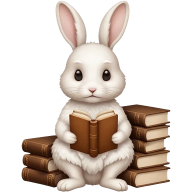 White rabbit sitting horizontally in a natural position on 4 legs, without a book. There are 3 books nearby. books lie on top of each other in brown tones emoji