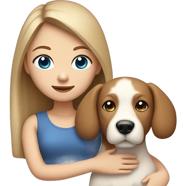 A girl with white skin, light brown hair and blue eyes holding her dog, a small Maltaneese emoji