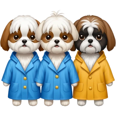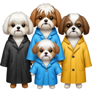 3 dogs wearing rain coats, one white maltese, 1 brown tri colour shihtzu and 1 black and white shitzu emoji