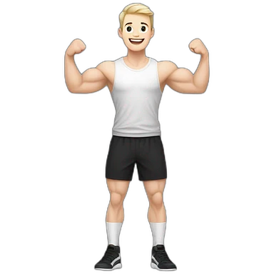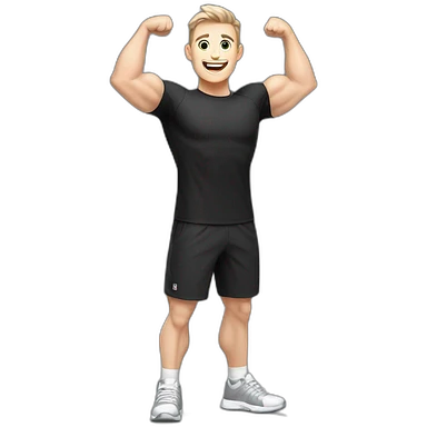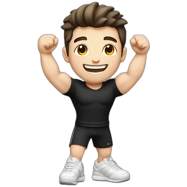 Joyful Celebrating victory Pale skinned Fit Man With the biceps and dark brown hair in black shirt, gray sports shorts and white Sneakers emoji
