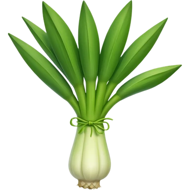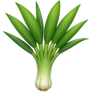 fresh whole leek, thick white base, pale to dark green leaves, open and tidy, layered and curved, fine roots, moist and crisp, 3D-rendered, minimal, no faces, transparent background emoji