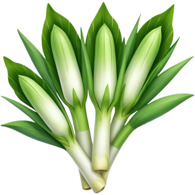 whole leek, long white stalk fading to green leaves, open and layered, slightly curved, fine roots at base, clean and crisp, 3D clean style, transparent background emoji