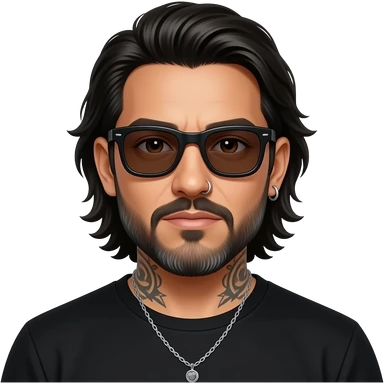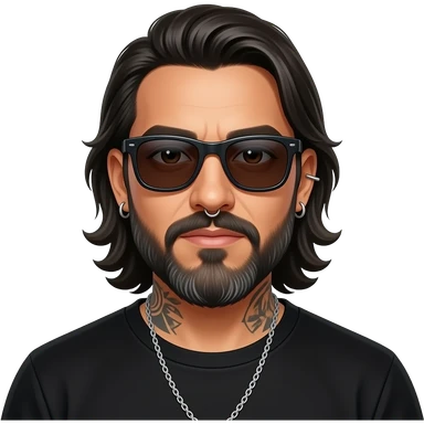 The handsome manly Latino podcast host with medium length hair, a long slightly graying beard and tattoos with his ears pierced 1 time each ear and a nose ring on the right side, dark brown eyes, wearing black, dark sunglasses, and jewelry, ready to fight emoji