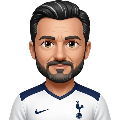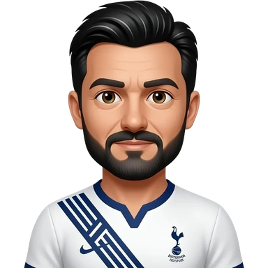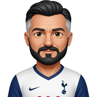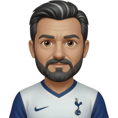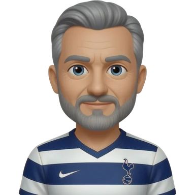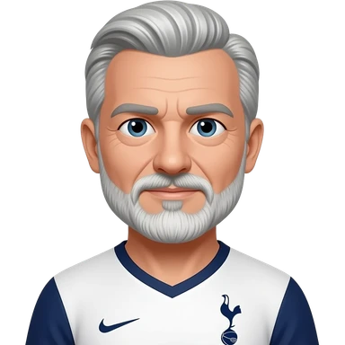 White man in his 50’s. Black and white hair parted in the exact middle. Hair is relatively short. Thin black and grey mustache and beard. More grey than black. Brown eyes. Wearing a Tottenham home jersey. Eyes are small, eyebrows are thick emoji | AI Emoji Generator