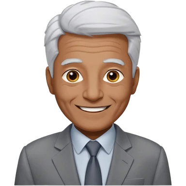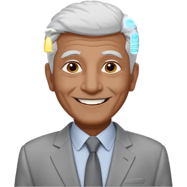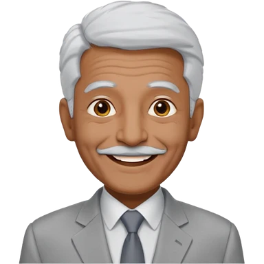 70 yr old man, very short spike white hair, pakistani, light grey business suit, big smile, dark skin, no facial hair, less hair emoji