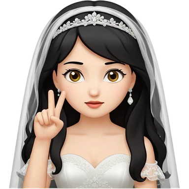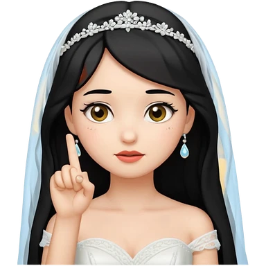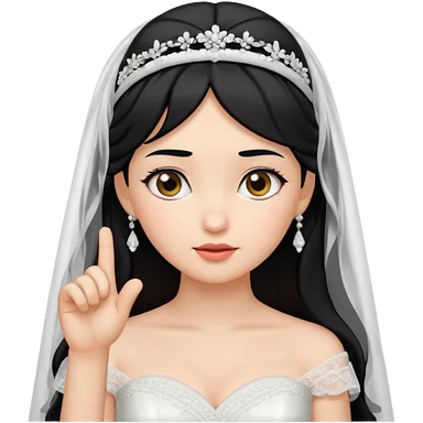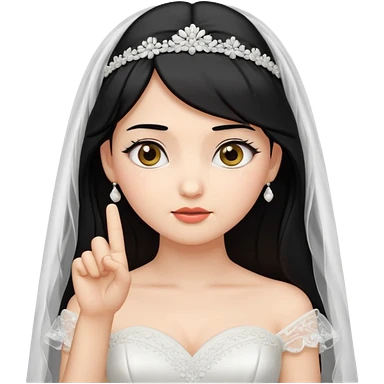 Black-haired bride in a white wedding dress and veil, curious expression, pointing to her head with her index finger, cute emoji style. emoji