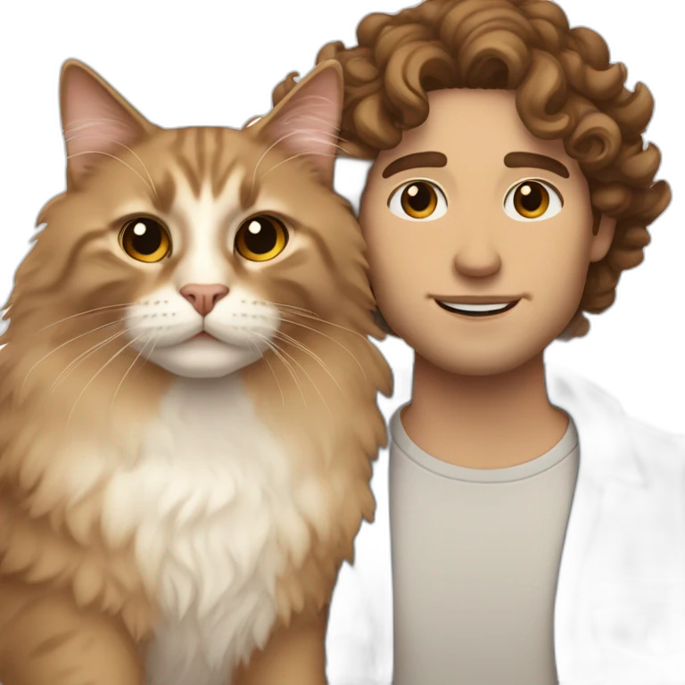 White man with brown curly hair, brown eyes, thick eyebrows, sharp jawline, bigger nose holding Ragdoll cat emoji | AI Emoji Generator