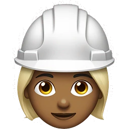 Waist-up girl wearing a white construction helmet. She has on a dark brown t-shirt. Her hair is very long and chestnut-colored. She has brown eyes with light makeup, rosy cheeks, and glossy lips. emoji