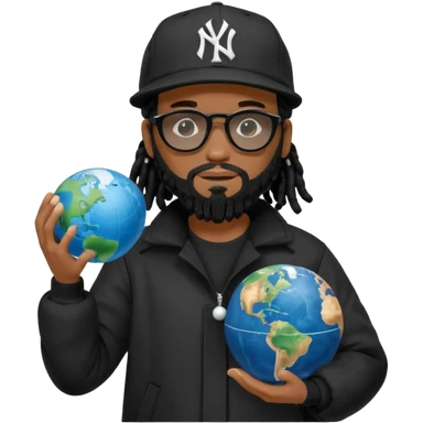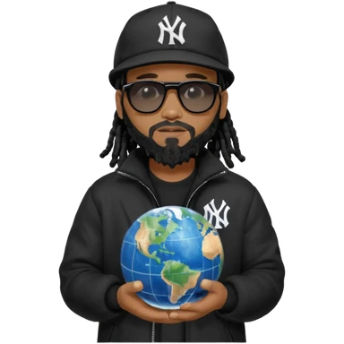 African American man with shoulder length black dreadlocks with black beard wearing black sunglasses wearing a black New York Yankees logo baseball cap wearing a black bubble winter coat holding a Globe in his hands emoji