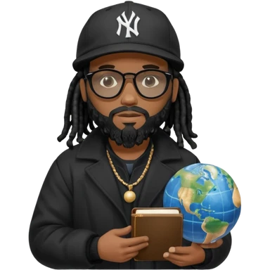 African American man with shoulder length black dreadlocks with black beard wearing black sunglasses wearing a black New York Yankees logo baseball cap wearing a black bubble winter coat holding a Bible and a Globe in his hands emoji