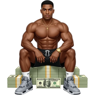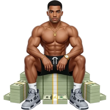 make a 20 year old man black skinned with like soooo many abs it’s hard to count and giant muscles wearing black jordan shorts and the jordan guy is white with grey jordan 4’s and a gold rolex watch on sitting on stacks of money so hih his feet don’t touch the ground emoji