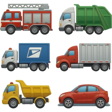 Fire truck, garbage truck, mail truck, semi trailer truck, dump truck, and car carrier emoji
