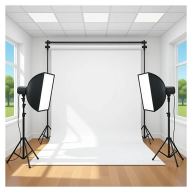 indoor white photography studio with camera equipment, with the windows closed emoji