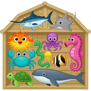 ocean animals inside the barn (farm): Blue swordfish, gray stingray, orange and yellow blowfish, purple octopus, turquoise crab, green eel, yellow jellyfish, orange and black angelfish, gray whale, green sea turtle, and pink seahorse emoji