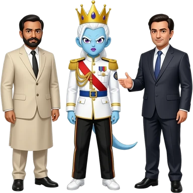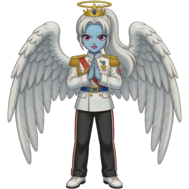 white ponytail haired pale blue skin purpled eyed and lips female angel vados from dragon ball super are wear gold tiara white military tunic arm badge shoulder cord medal red sash blue belt black trouser with two side stripes white shoes to meets with both hand joining 56 yrs maharana pratap singh emoji