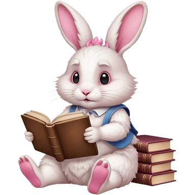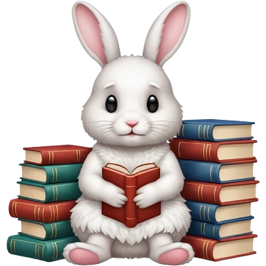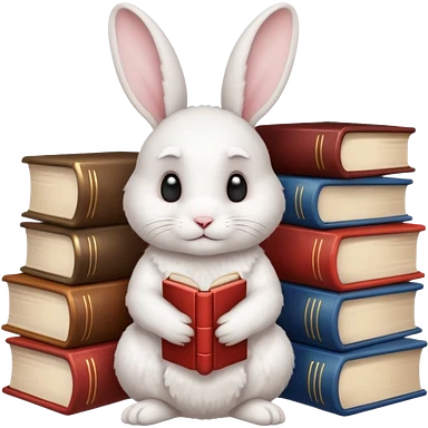 White rabbit sitting on 4 legs next to a stack of books consisting of 3 books emoji