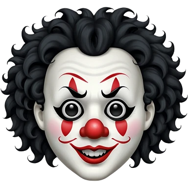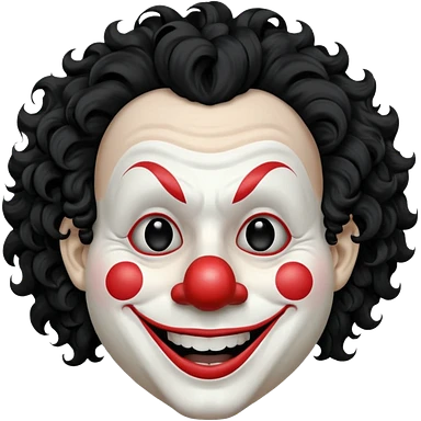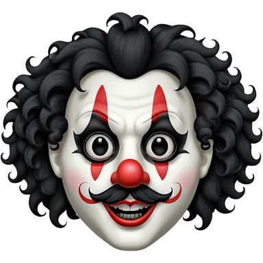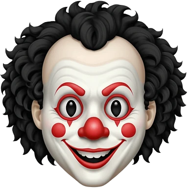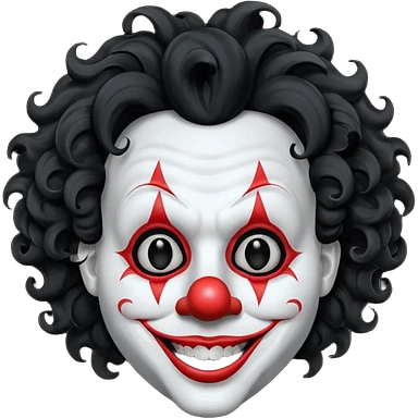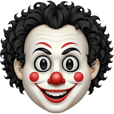 generate white clown mask emoji with a big curly black hair black coloured lips and no teeth, no red nose but instead long and pointy white nose with no nostrils, pitch black eyes with no pupils, no brows emoji