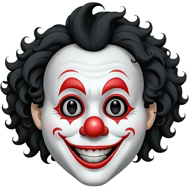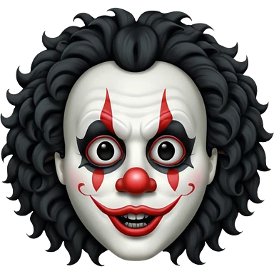 generate white clown mask emoji with a big curly black hair wide black coloured smile, no red nose but instead long and pointy white nose with no nostrils, pitch black eyes with no pupils, no brows emoji