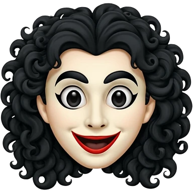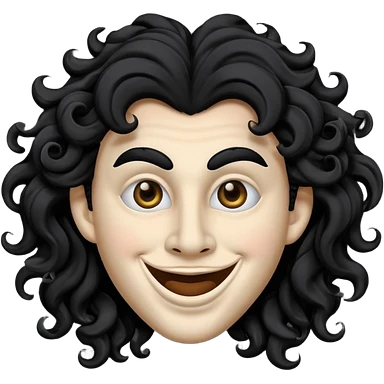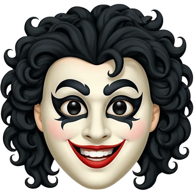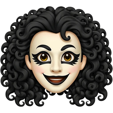 generate theatre mask emoji with a big curly black hair wide black coloured smile, long and pointy white nose with no nostrils, pitch black eyes emoji