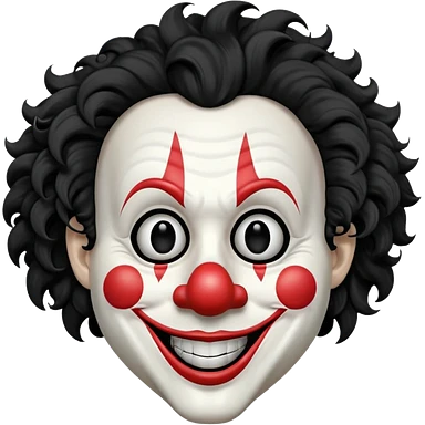 generate white clown mask emoji with a big curly black hair wide black coloured smile, no red nose but instead long and pointy white nose with no nostrils, pitch black eyes, no brows emoji